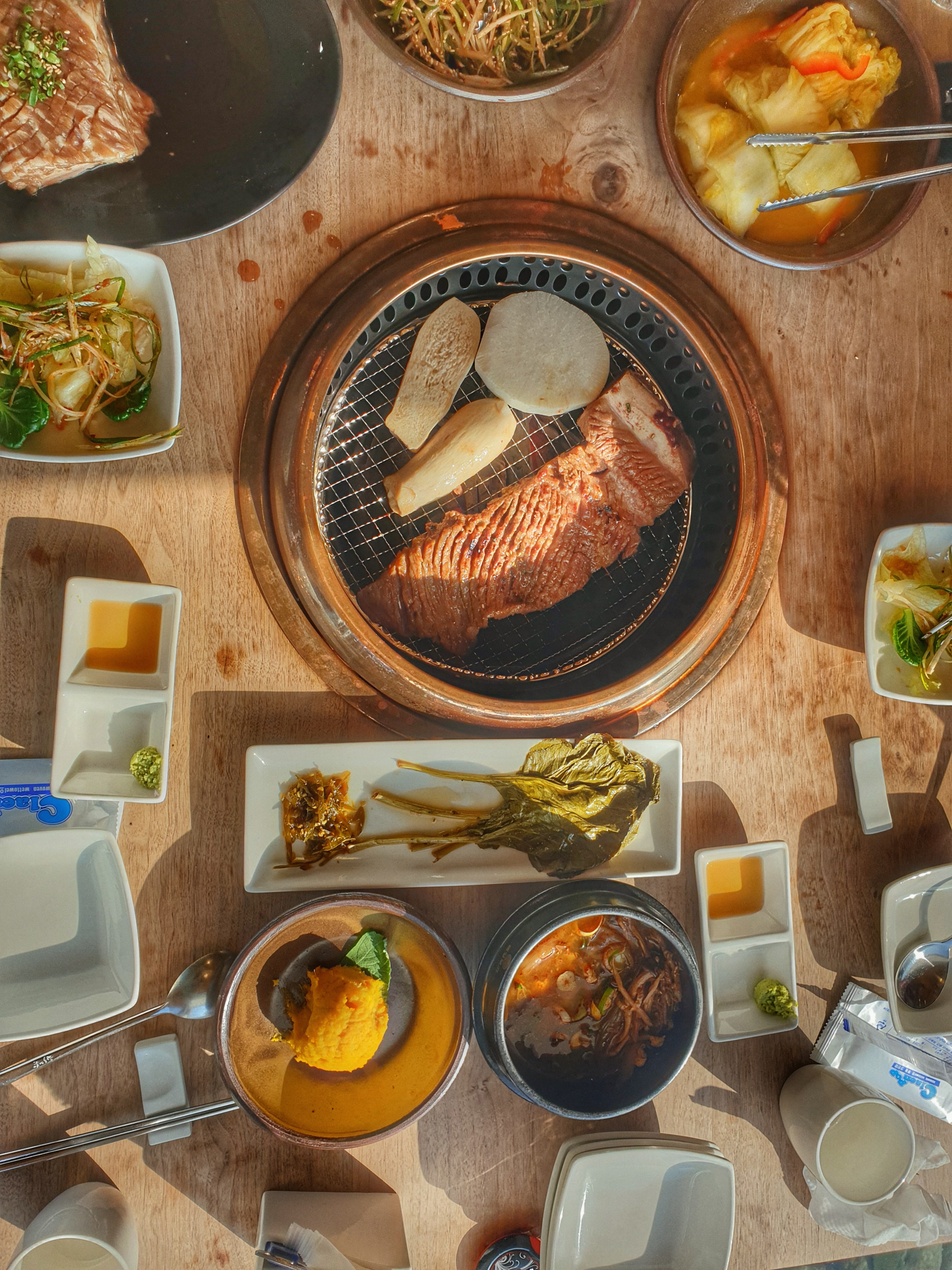 Le samgyeopsal signifie « trois couches de gras » et fait référence à la poitrine de porc, généreusement grillée sur une plaque au centre de la table. Servi avec des feuilles de salade et une variété de condiments (ail, pâte de soja, huile de sésame), ce plat est parfait pour partager un moment convivial.