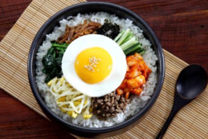Le Bibimbap est un plat traditionnel coréen originaire de la région de Jeonju. Il est servi dans un bol en pierre très chaud. Le bibimbap se compose principalement de riz et de légumes finement coupés. Il peut ensuite être agrémenté de viande, ou d’un œuf. Pour accompagner le tout, il y a une sauce à base de pâte de piment et d’huile de sésame.